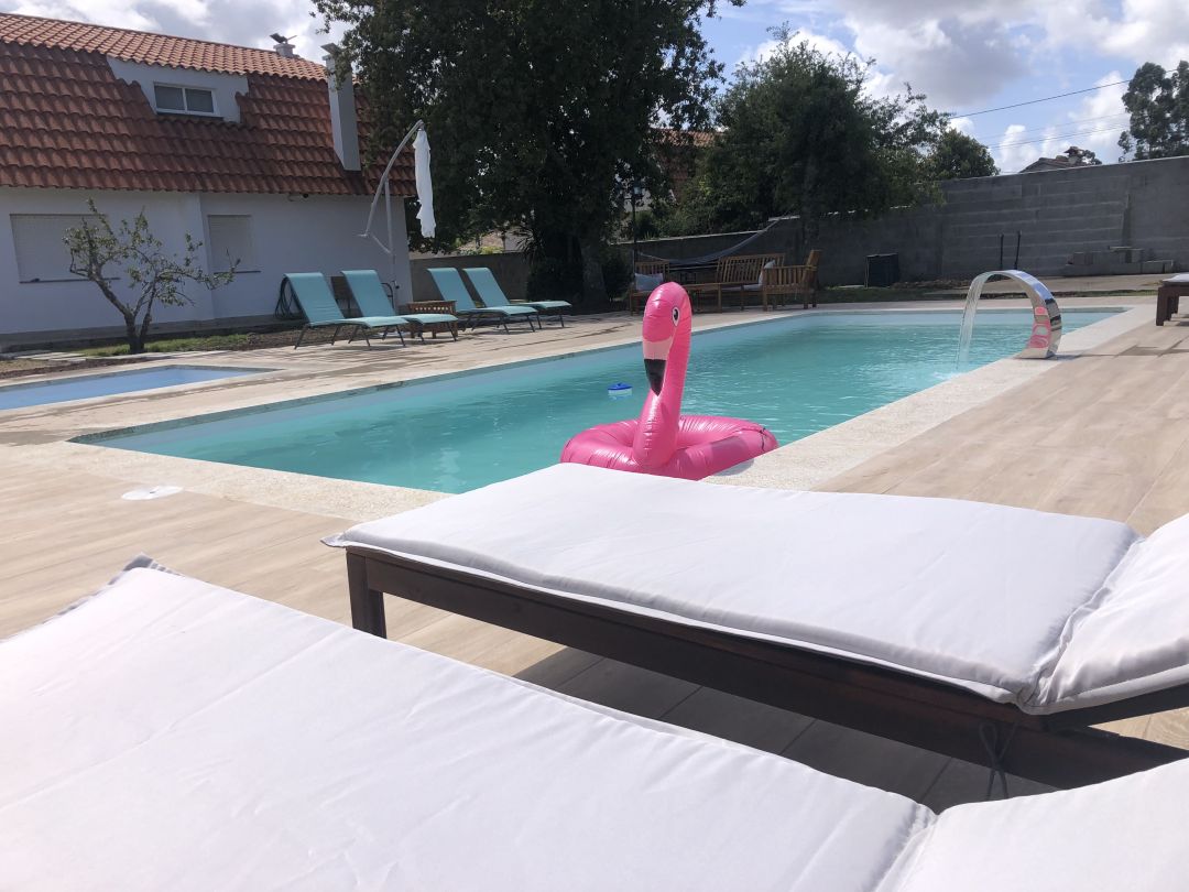 Excelente chalet de piedra con piscina privada perfectamente acondicionado para grupos o familias de hasta 10-13 personas (máximo 13 personas, contando con camas-suplemento 90cm) cerca de las playas (a solo 2Km de las playas fluviales de Goián o Vilanova de Cerveira -Portugal-) con finca cerrada de más de 1000 m2. Dentro de la casa dispondrán una gran cocina americana, amplia y bien equipada, con barra comunicando con el enorme salón (de más de 40m2) con TV pantalla gigante y chimenea francesa de leña; 2 cuartos de baño completos (uno con bañera y otro con cabina de ducha hidromasaje) y 5 dormitorios dobles (todos los de matrimonio con TV). Delante de la casa está la terraza y el jardín. Hay garaje cerrado y suficiente sitio para aparcar, delante de la puerta, 2 coches. Dispondrán de 2 piscinas para uso exclusivo de nuestros huéspedes: Una grande de 10x4m y otra más pequeña de poca profundidad (para niños pequeños), con mucha terraza, tumbonas, sofás de exterior, mesas y sillas, etc... Hay una gran barbacoa, cubierta y acristalada, que puede ser utilizada todo el año, de día y de noche (hay electricidad), completada con una buena mesa y bancos de piedra; Cuenta con una sala de ocio: con gimnasio (banco de abdominales, pesas mancuernas, bicicleta spinning, bicicleta elíptica, plataforma vibratoria -tipo vibropower-), mesa de billar americano y diana de dardos, y un cuarto de baño completo (con ducha). Está en una zona soleada, céntrica y discreta, con mucha intimidad. Hay conexión a internet WIFI.